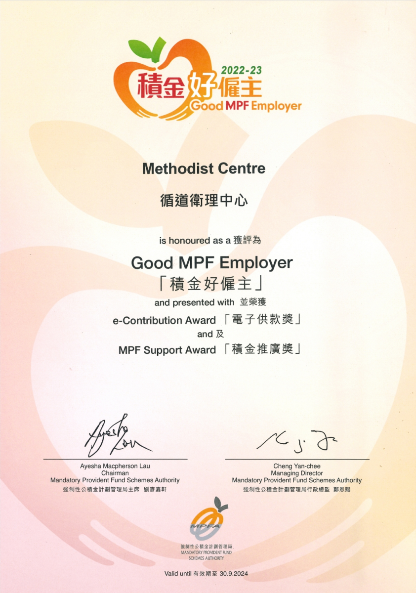 积金局每年举办「积金好雇主」嘉许计划,促进雇主履行法律责任,同时表扬重视雇员退休保障的好雇主,循道卫理中心今年再度获积金局嘉许为「积金好雇主2022- 23」,本中心对此深感荣幸,未来将一如既往重视员工福祉,致力成为保障及加强雇员退休福利的模范雇主。